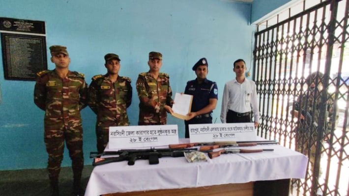 নরসিংদীতে গত কয়েকদিনের জেলা কারাগার থেকে লুন্ঠিত অস্ত্রসহ ৫টি আগ্নেয়াস্ত্র ও রাবার বুলেট উদ্ধার করেছে বাংলাদেশ সেনাবাহিনী। রবিবার ( ১৮ আগস্ট) দুপুরে নরসিংদী মুসলেহ উদ্দিন ভূইয়া স্টেডিয়ামের সেনা ক্যাম্পে এক সংবাদ সম্মেলনে এ তথ্য জানান ২৮ ইষ্ট বেংগল এর অধিনায়ক লেফটেন্যান্ট কর্ণেল মোহাম্মদ ফাহিম মাহবুব পিএসসি। এসময় তিনি নরসিংদী সদর মডেল থানার ভারপ্রাপ্ত কর্মকর্তা (ওসি) তানভীর আহমেদ’র কাছে অস্ত্র গুলো হস্তান্তর করেন।