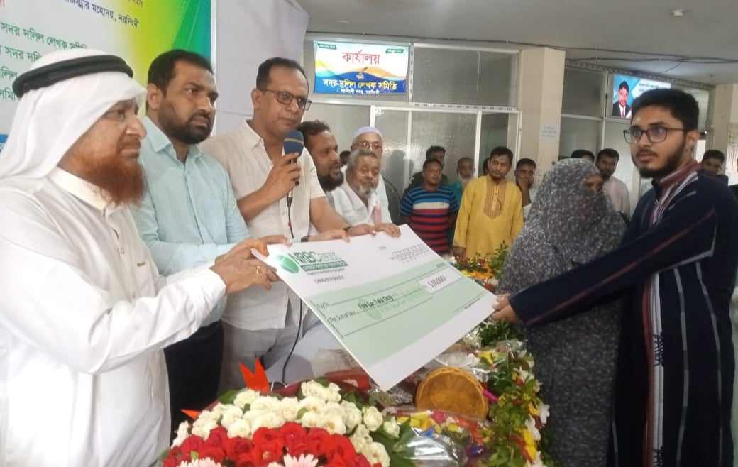 বাংলাদেশ দলিল লেখক সমিতির সভাপতি আলহাজ্ব নূর আলম ভূঁইয়ার সভাপতিত্বে মৃত্যু ভাতা প্রদান অনুষ্ঠানে প্রধান অতিথি হিসেবে উপস্থিত ছিলেন নরসিংদী জেলা রেজিস্ট্রার আবুল কালাম মো. মনজুরুল ইসলাম অনুষ্ঠানে প্রধান আলোচক হিসেবে উপস্থিত ছিলেন সদর সাব রেজিস্ট্রার এস এম মোস্তাফিজুর রহমান।