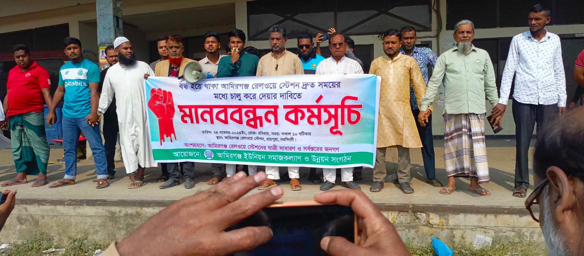 কয়েক বছর ধরে নরসিংদীর রায়পুরার আমিরগন্জ রেল স্টেশনটি কয়েক বছর ধরে বন্ধ রয়েছে। লাখো মানুষের দুর্ভোগ কমাতে স্টেশনটি পুনরায় চালুর দাবিতে মানববন্ধন করেছে সামাজিক সংগঠন ও স্থানীয় এলাকাবাসি।রোববার বেলা ১১ টায় উপজেলার আমিরগন্জ রেলস্টেশন প্লাটফর্মে এ মানববন্ধন কর্মসূচি পালন করা হয়।