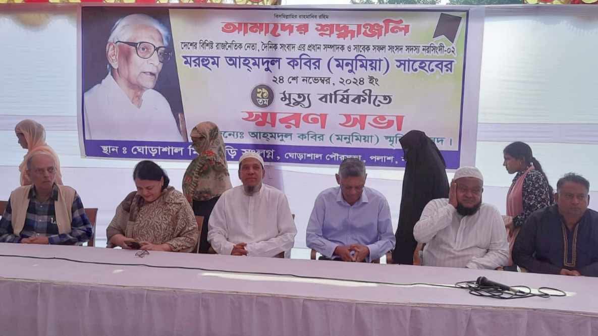 নরসিংদীর পলাশে দোয়া, শ্রদ্ধা ও ভালোবাসায় দৈনিক সংবাদ এর প্রধান সম্পাদক, দেশের প্রগতিশীল ধারার রাজনীতির পুরোধা ব্যক্তিত্ব ও সাবেক সংসদ সদস্য আহমদুল কবির মনু মিয়ার ২১তম স্মরণ সভা পালন করা হয়েছে।