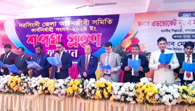 নরসিংদী জেলা আইনজীবী সমিতির শপথ গ্রহণ অনুষ্ঠিত হয়েছে। সোমবার (১ জানুয়ারী) দুপুরে জেলা আইনজীবী সমিতির কার্যালয়ের সম্মেলন কক্ষে এই শপথ গ্রহণ অনুষ্ঠিত হয়।